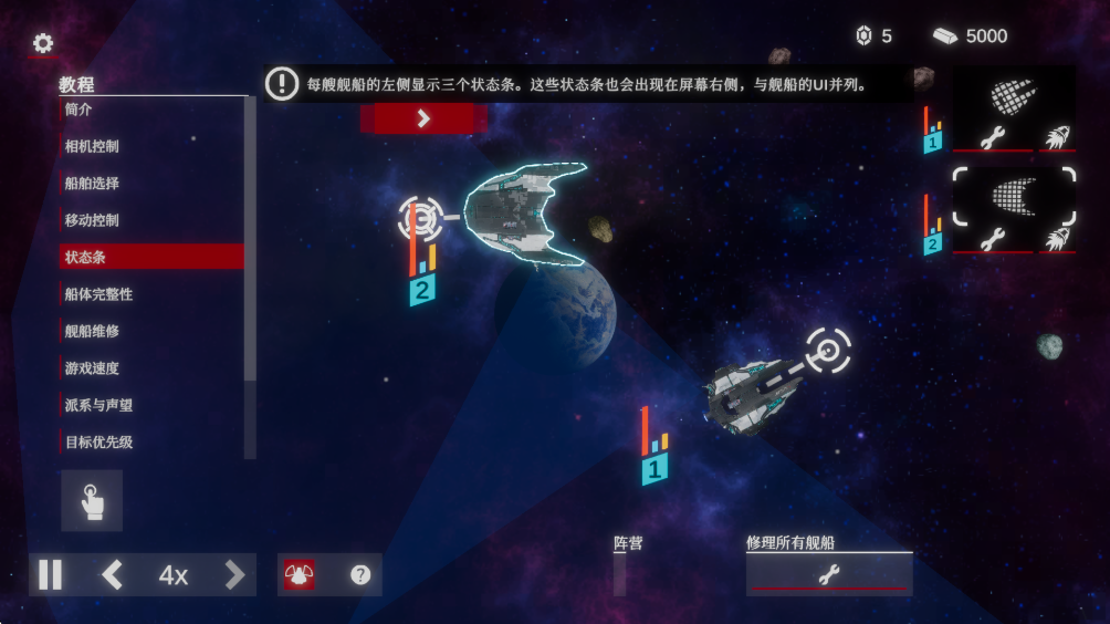 5.每腰舰船的左侧显示三个状态条,这些状态条也会出现在屏幕右侧,与舰船的UI并列。