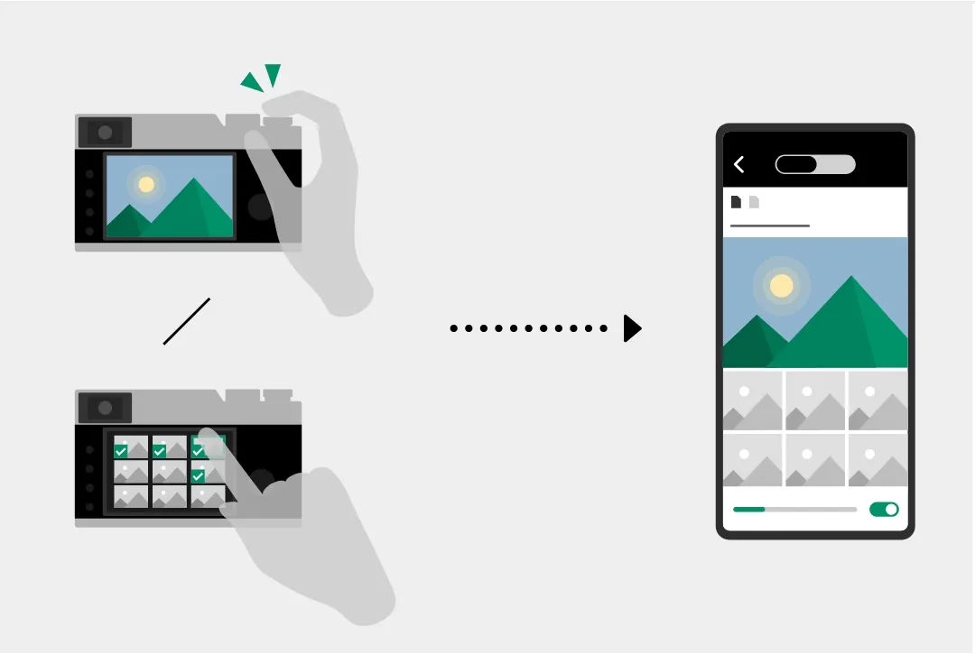3.图像传输预定:一旦将图像添加到相机的图像传输预定队列中,拍摄或回放模式下使用相机时这些图像将被自动发送到手机。