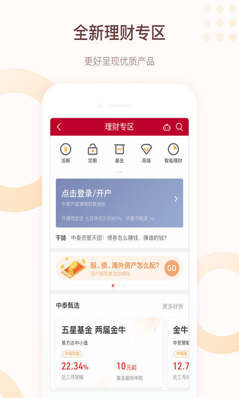 中泰齐富通app官方是一款可以在手机上开户炒股的app,手头有了闲钱怎么办?让闲钱放着也是放着,还不如放到股市之中,根据股市的走向,来获取利润。很多人对于股票不是很懂,app中也有很多的顾问,可以资讯。在了解了各种政策以及资讯信息之后自己再作判断。