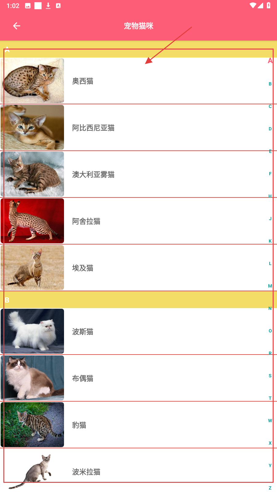 2、点【喵喵】进入宠物猫咪列表,按字母找特定品种(如奥西猫)。