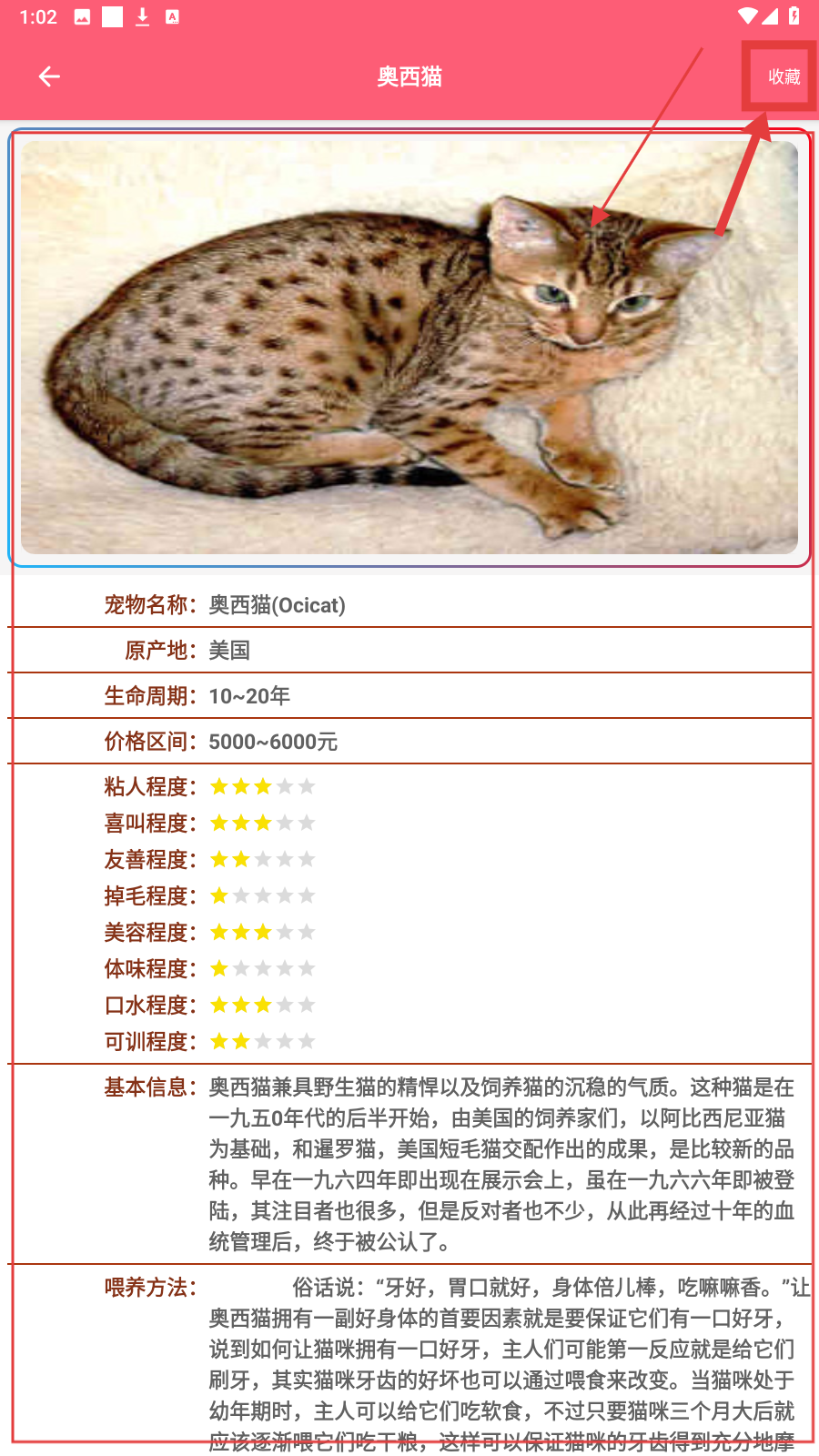 3、选奥西猫,查看原产地、价格、性格等详情,了解饲养要点。点击右上角【收藏】按钮。