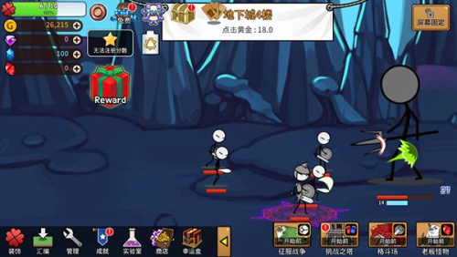 4、挑战各类强敌:在挑战之塔与变坏英雄打斗,格斗场对战巨龙,最终与魔王激战,利用奖励强化英雄,收获乐趣。