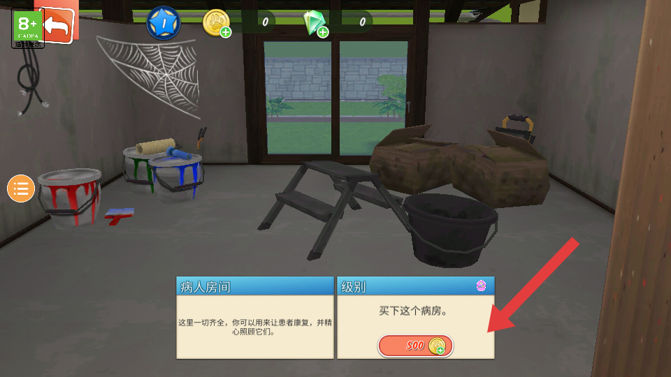 1、开局优先攒金币做任务或者活动,点击病人房间下方500金币按钮,买下病房解锁功能,清理杂物蛛网、油漆桶。