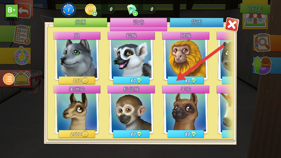 2、打开商店-货币栏,用初始资源买低价动物如狐猴 80钻石,放到病房提升收益,同步做左侧任务清单按钮领奖励。