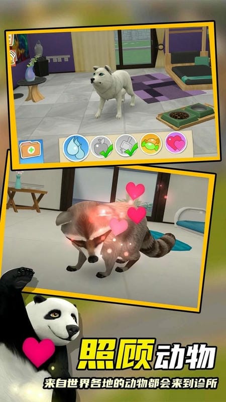 2、小动物照料与场景互动:解锁婴儿兔、婴儿猫照料任务后,专注陪伴新生小动物,观察其状态并及时喂养、护理,在非诊疗的时段,购买礼物和鲜花。