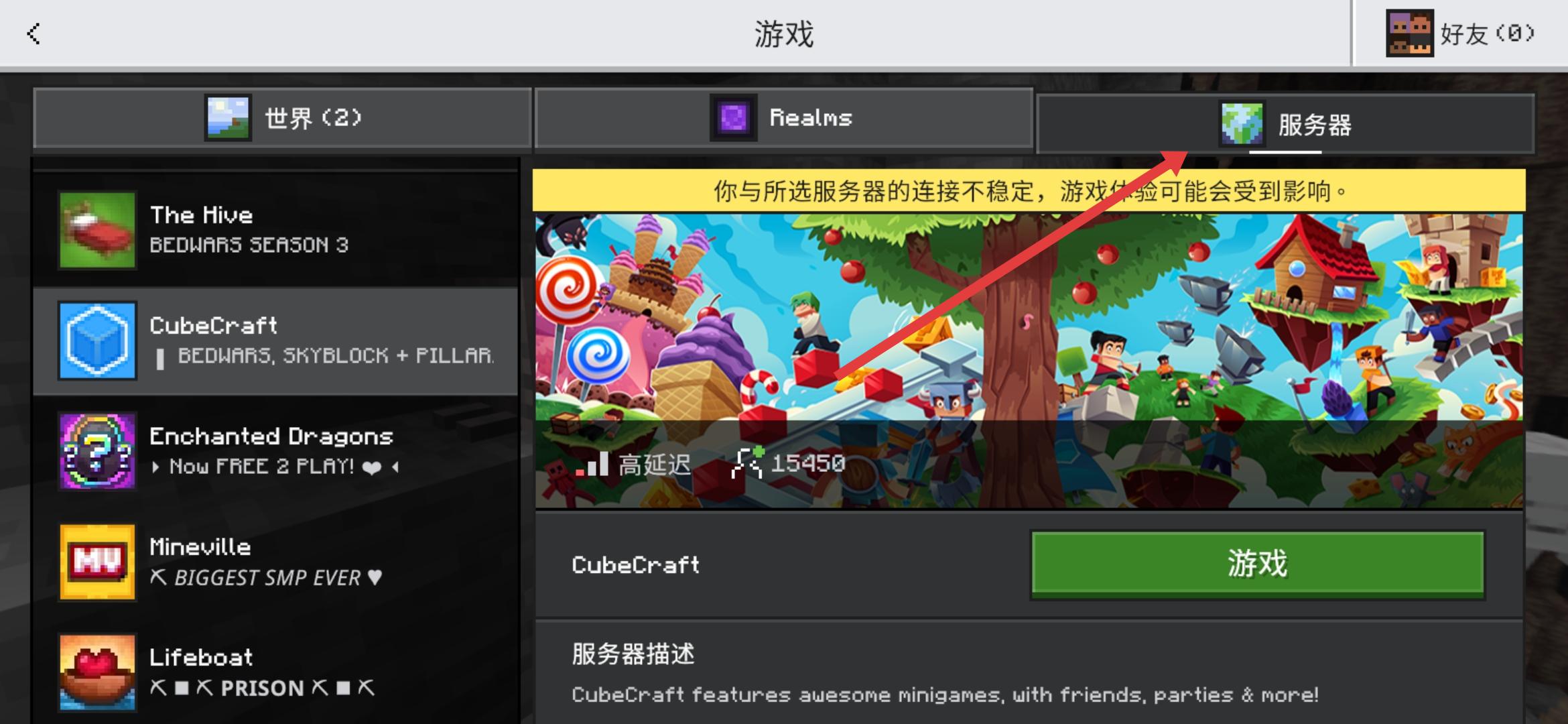 1、打开我的世界游戏的主界面,点击顶部服务器标签,进入服务器列表页面,查看可选的在线服务器。