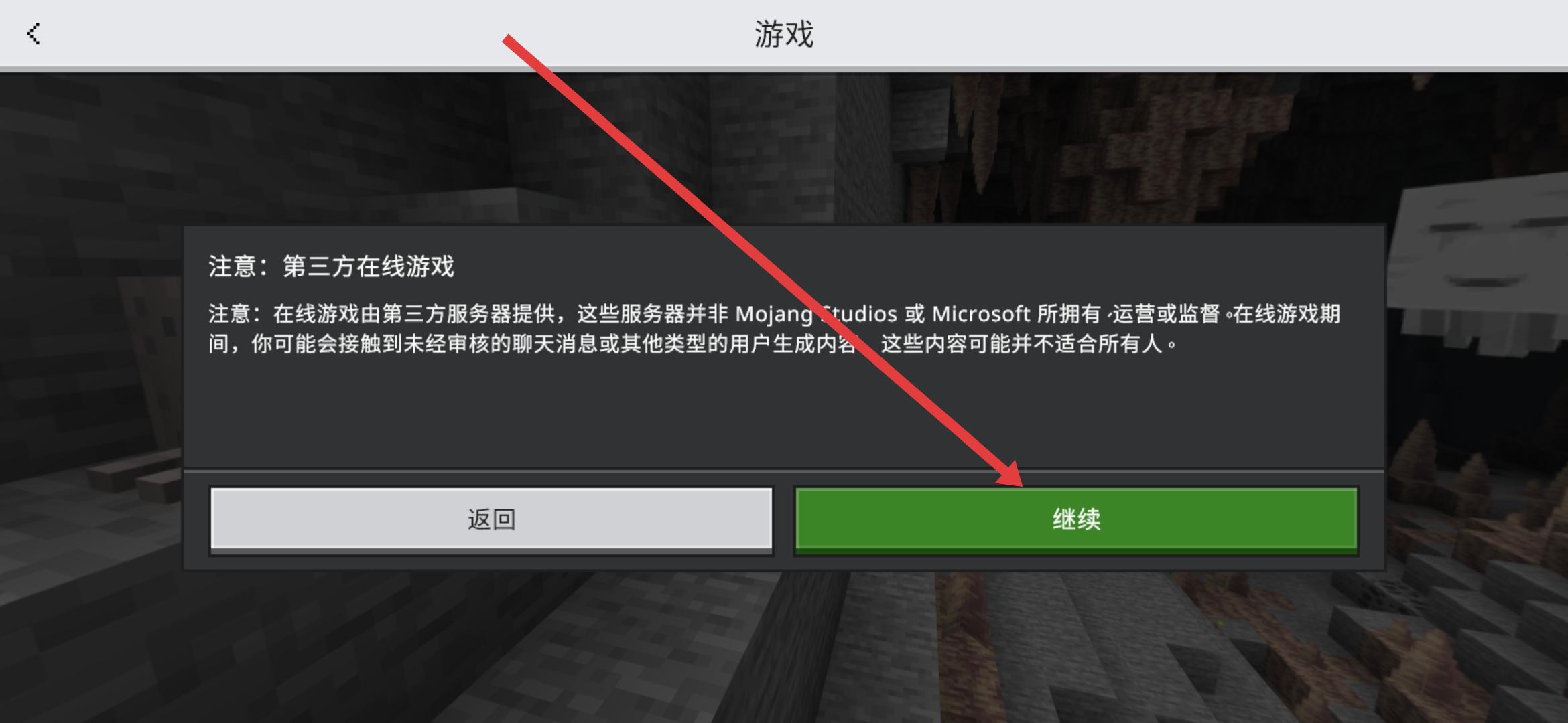 2、后续可能会弹出第三方服务器的提示框,需要阅读提示后点击继续,确认进入在线服务器的模式。