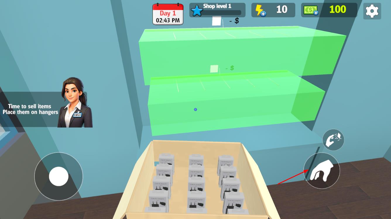 1、进入游戏后选择店铺初始布局,在空货架上摆放首批电子产品,调整装饰元素打造基础购物环境,准备迎接第一位顾客。