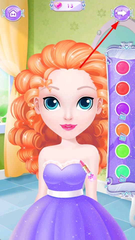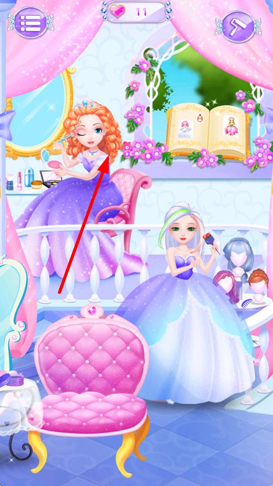 2、当公主妆容初步完成后,点击画面右上方带有箭头标识的按钮,切换到更多造型设计场景,拓展造型搭配的可能性。