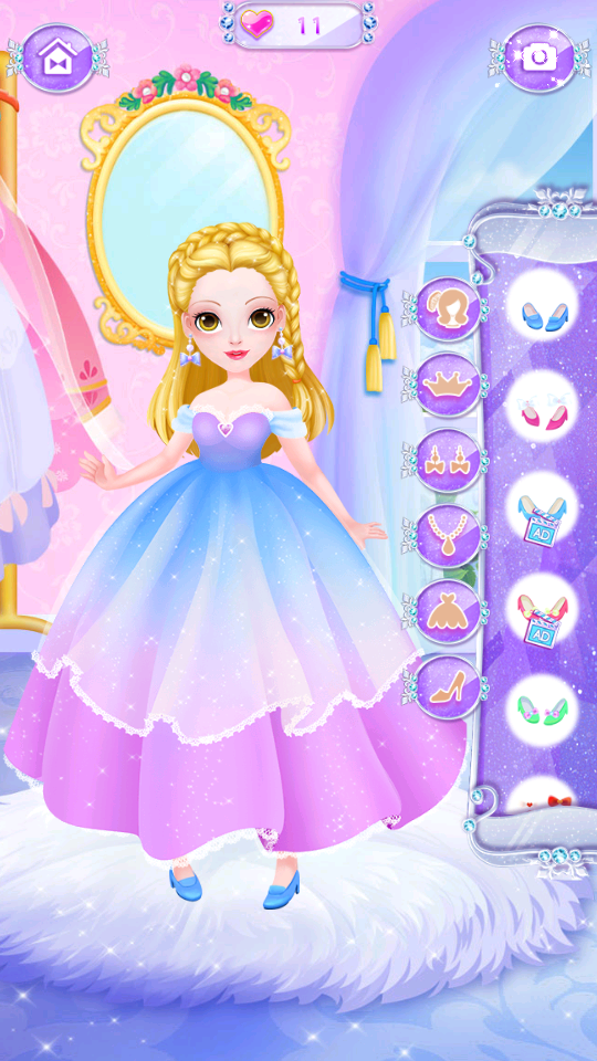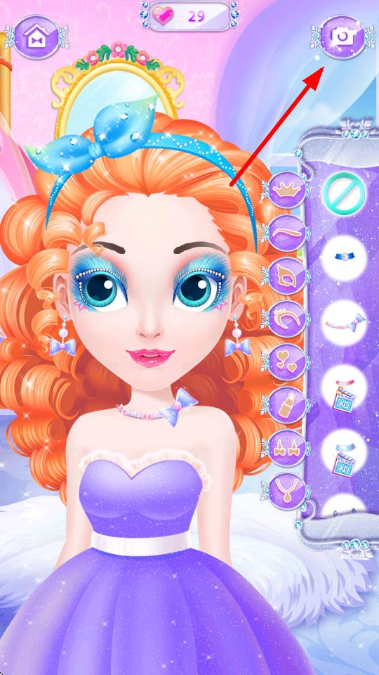 3、完成公主的整体妆容和造型设计后,点击画面右上方的相机图标,对精心装扮好的公主进行拍照留念,保存下美丽的造型成果。