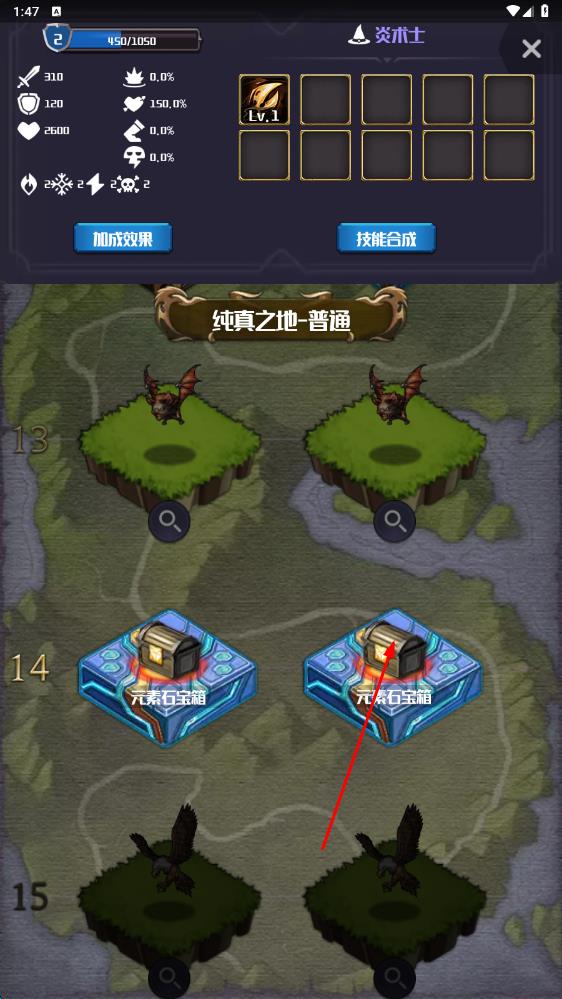 2、在探索地下城时,通过击败魔物、开启箱子获取元素石,将其放到魔法阵合成新技能,同时完成支线任务解锁更多元素,佩戴元素遗物提升实力。