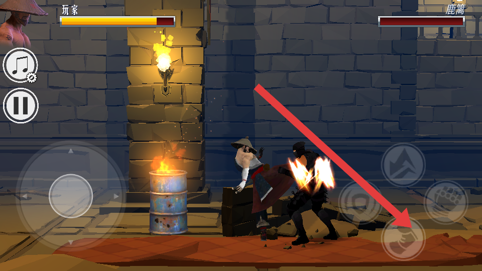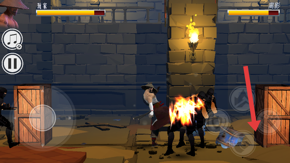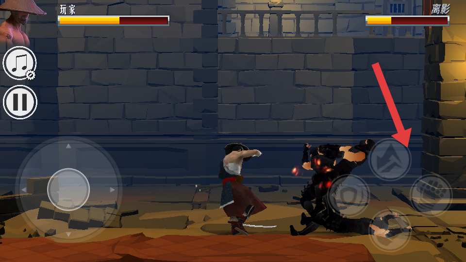 1、用左侧的摇杆控制来移动,遇到敌人的黑衣忍者时,点击右侧攻击按钮连招,优先打前排的敌人。