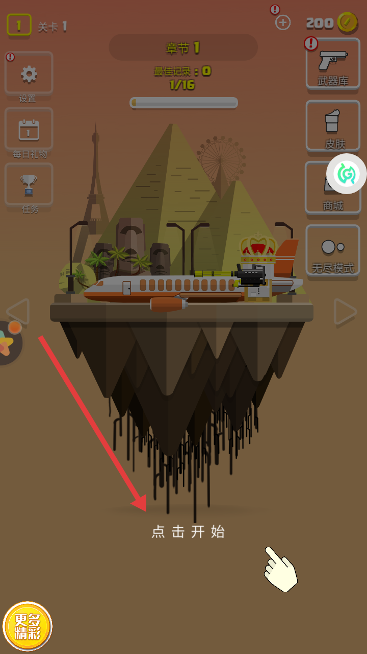 1、点击主界面点击开始,进入关卡1,提前查看武器库,熟悉初始装备,为射击敌人做准备。