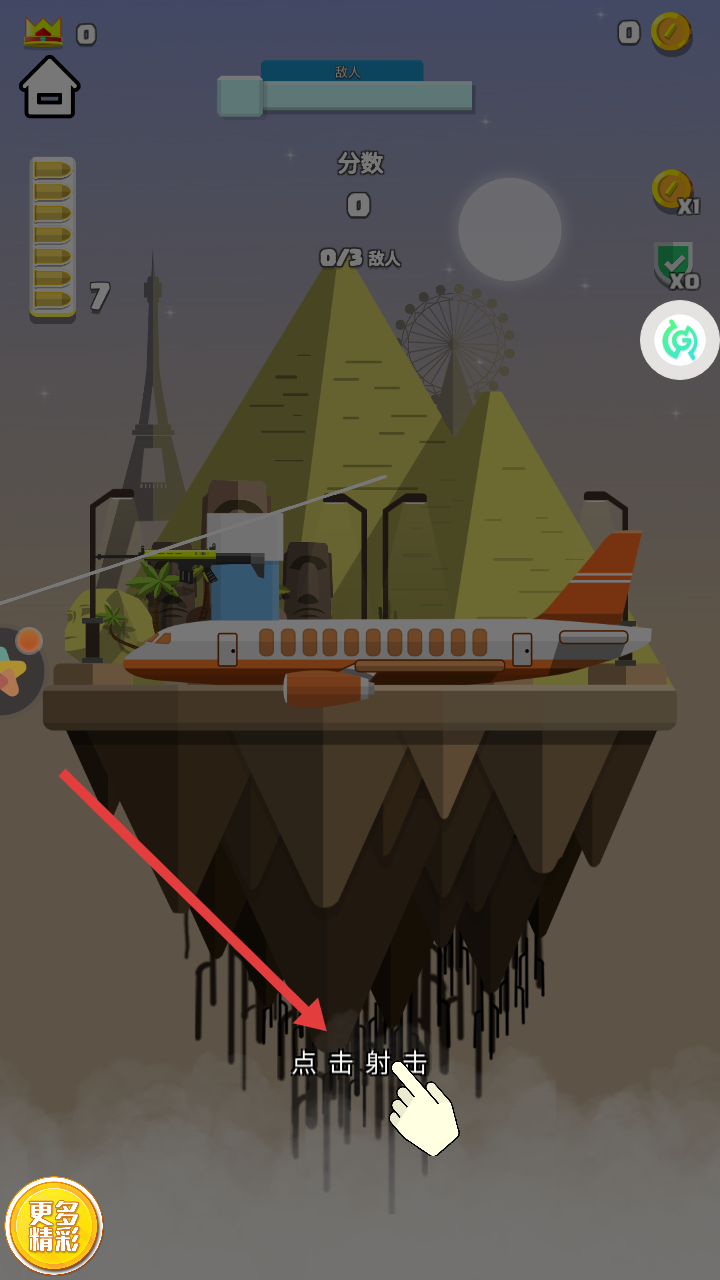 2、战斗时,依据点击射击提示,瞄准场景中敌人,快速射击,完成消灭3个敌人目标。