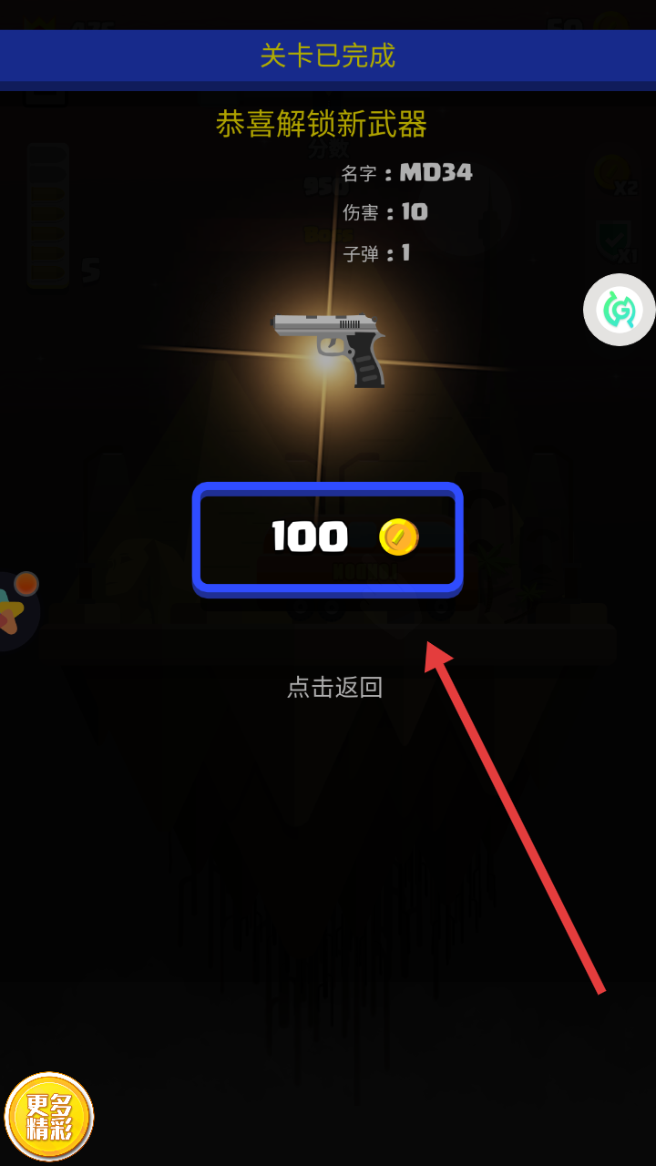 3、关卡完成后,领取新武器MD34与100金币奖励,点击返回,可强化武器或解锁皮肤,继续挑战。