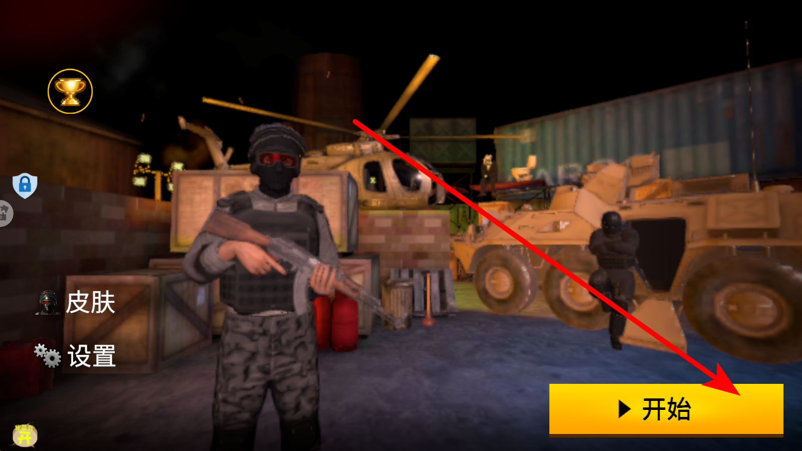 1、主界面启动进入游戏主界面,点击右下角黄色开始按钮,界面切换至场景选择页,同步展示皮肤设置等功能入口,开启战斗准备。