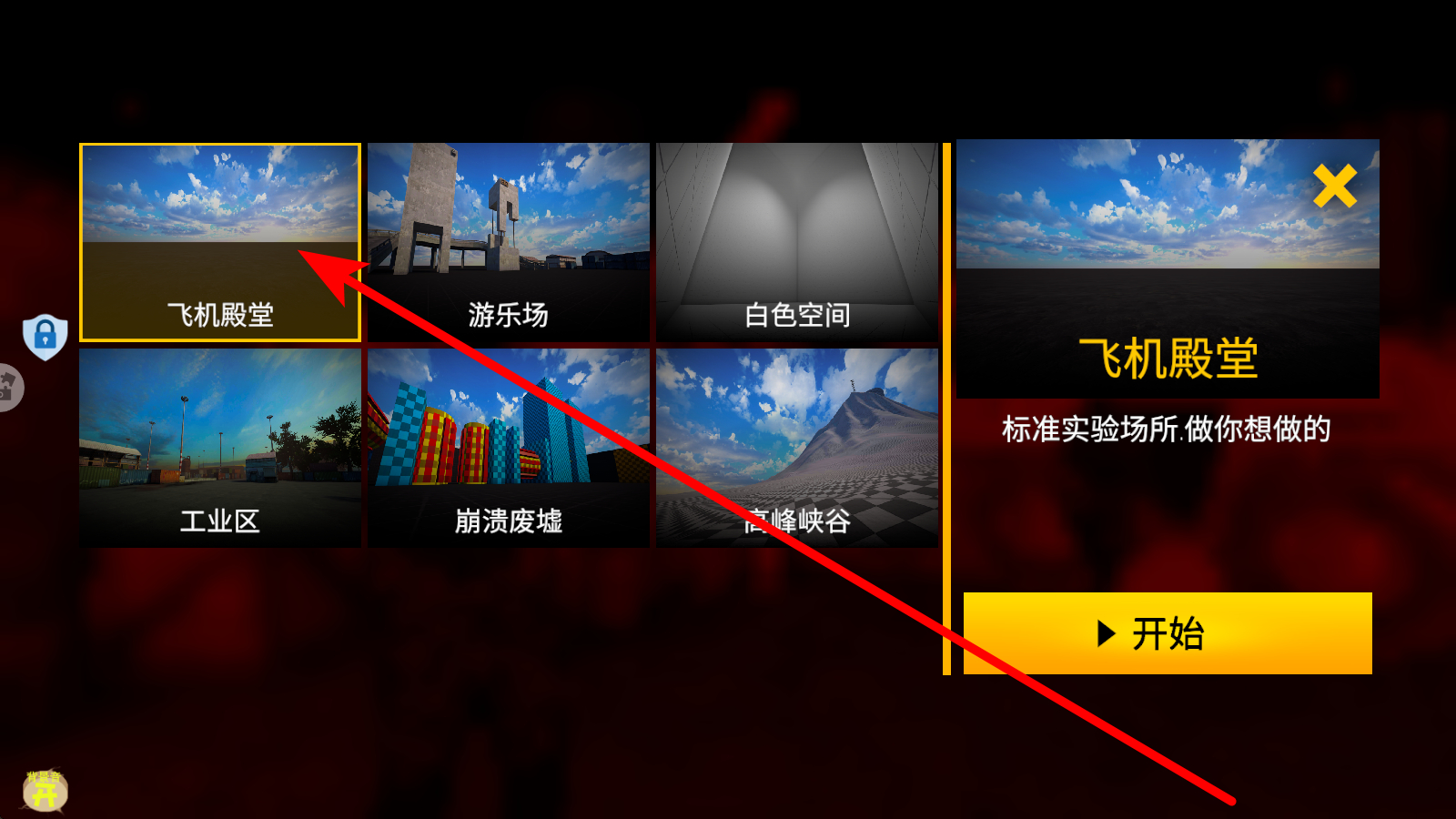 2、进入场景挑选在场景选择页,可选飞机殿堂游乐场等不同地图,点击目标场景飞机殿堂,再点下方开始进入对应沙盒战场。