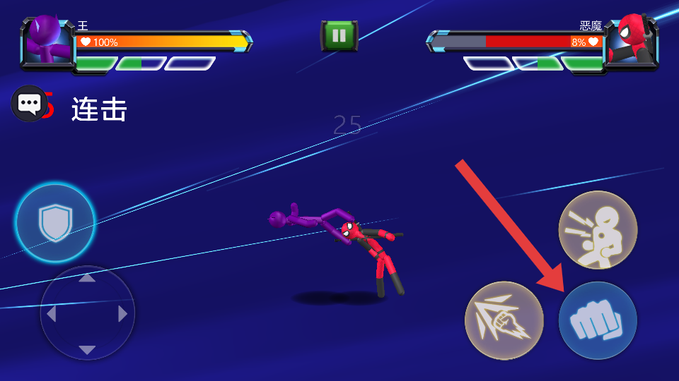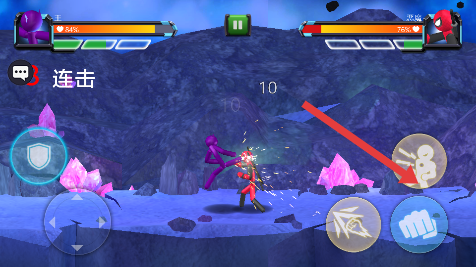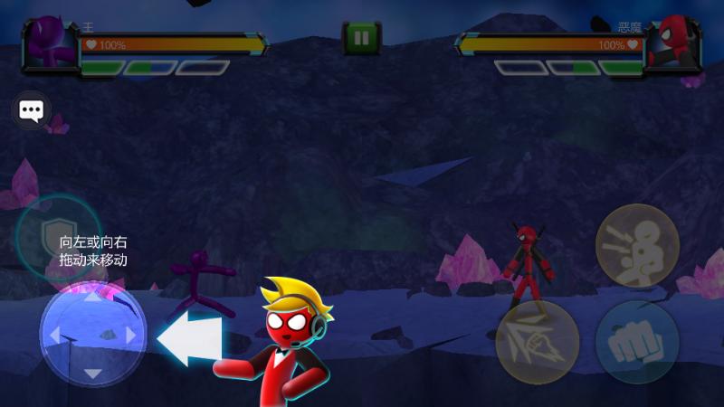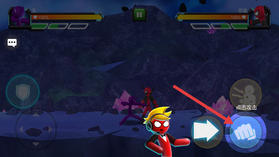 1、选上方紫色角色开局,用左侧摇杆控制角色移动,靠近恶魔红色敌人后,点击右侧拳头按钮触发攻击。