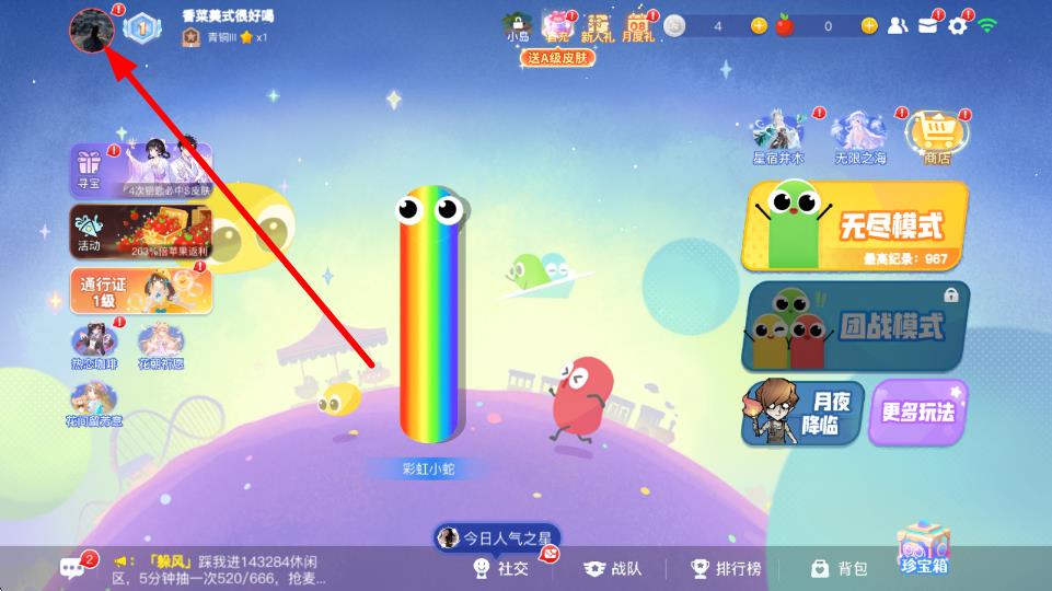 1、打开贪吃蛇大作战游戏,进入游戏主界面,点击左上角自己的头像,进入个人信息界面。