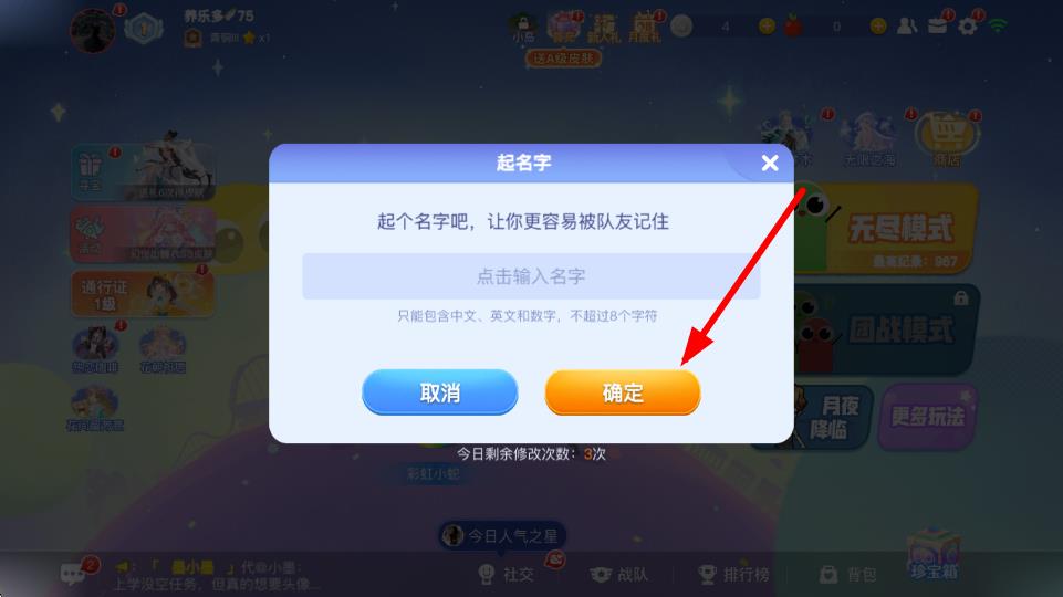 3、完成实名认证后,会弹出起名字界面,输入完成后,点击确定按钮,即可使用该昵称开始游戏。若不想此时取名,也可点击取消。