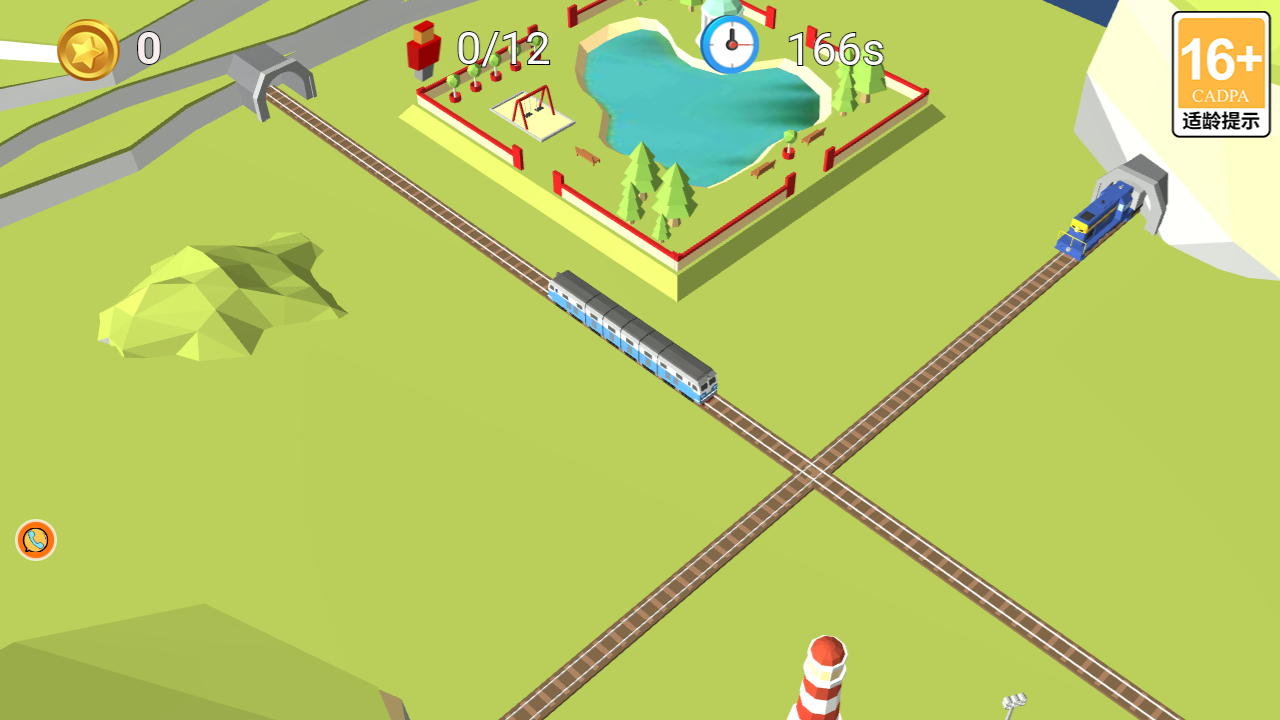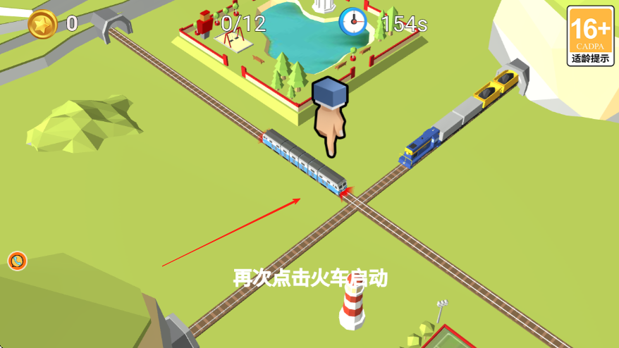 1、进入游戏,查看限时【154s】与任务进度【0/12】,点击火车暂停,再次点击按红箭头方向启动火车,避免碰撞。