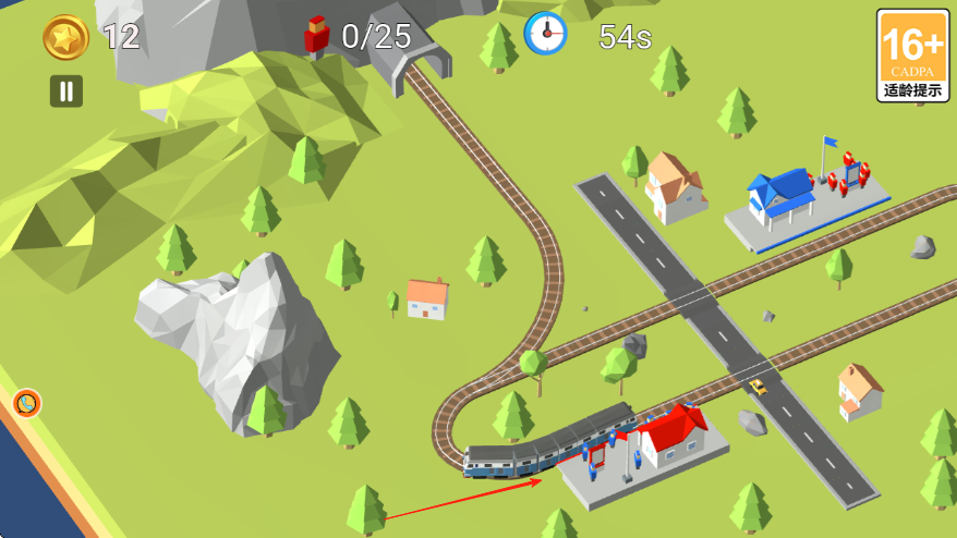 3、持续规划火车行驶路径,及时启停火车,按红箭头指引完成更多运输任务,在规定时间内达成【0/25】目标。