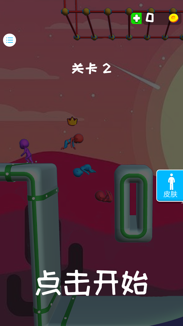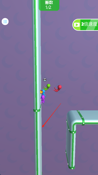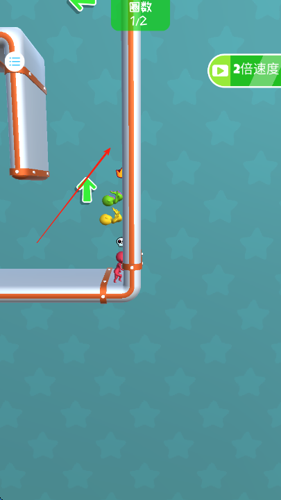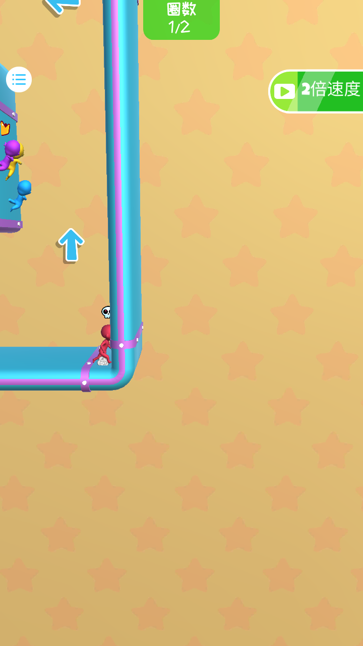 3、继续操控小人前进,遭遇其他颜色小人阻拦时,找准时机躲避,按红箭头方向抵达终点,完成关卡。
