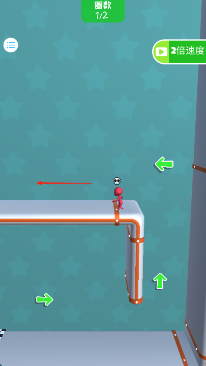 2、根据绿色箭头提示调整行进方向,遇到骷髅标志小心避开危险,让小人安全通过管道转折处。