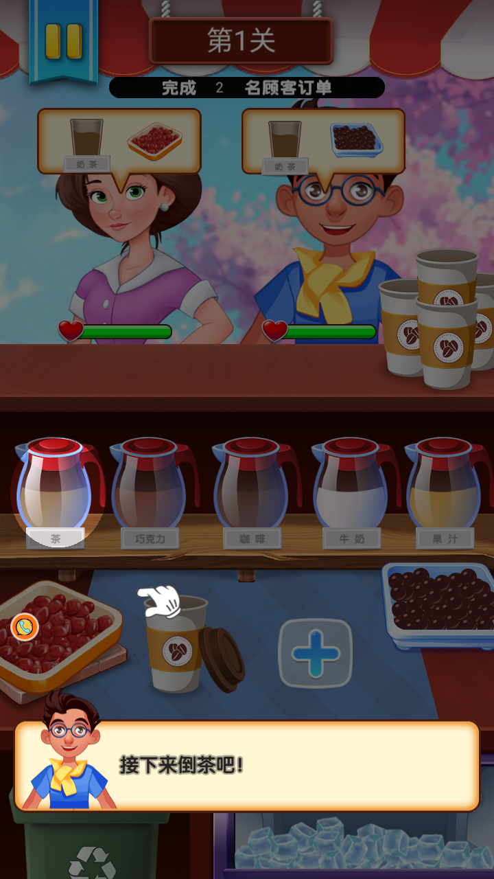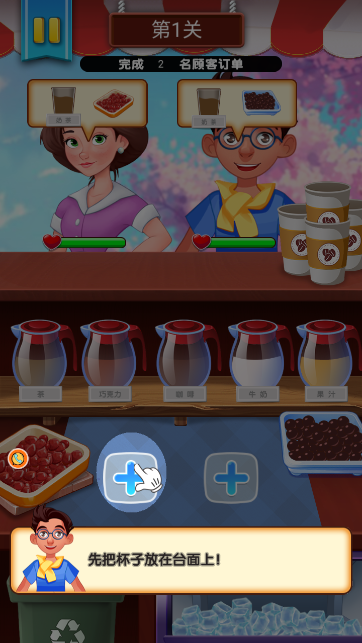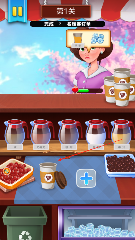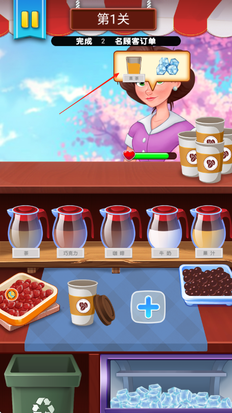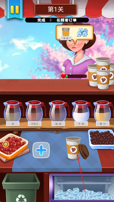 1、进入【第1关】,查看顾客头顶订单提示红箭头所指,了解顾客所需饮品及配料,比如这单需要加冰的饮品。