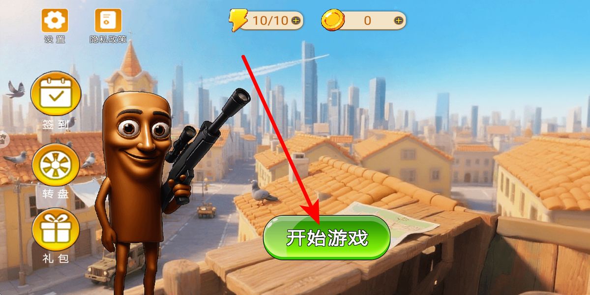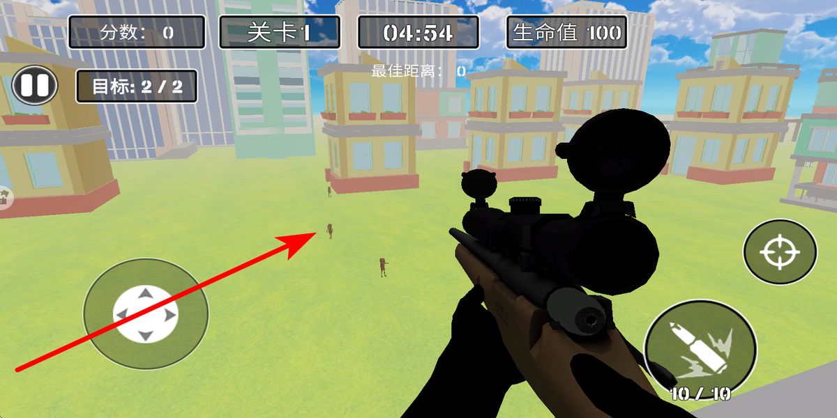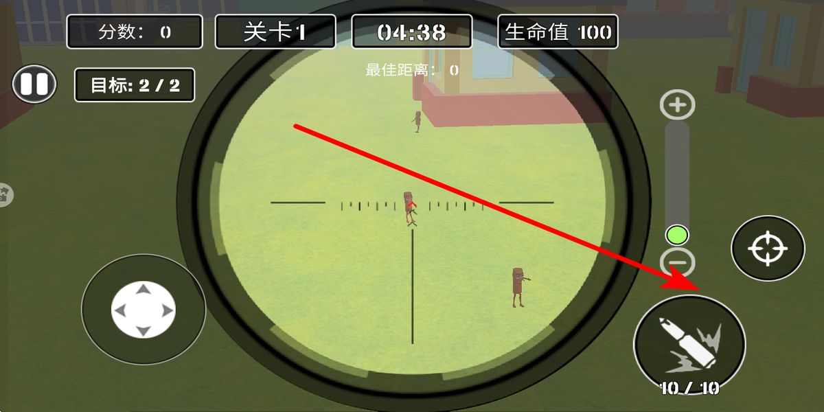 1、瞄准锁定目标:通过高精度狙击镜观察场景,发现四处乱窜的木棍人后,滑动屏幕调整瞄准镜焦距,将十字准星锁定目标,为精准射击奠定基础。