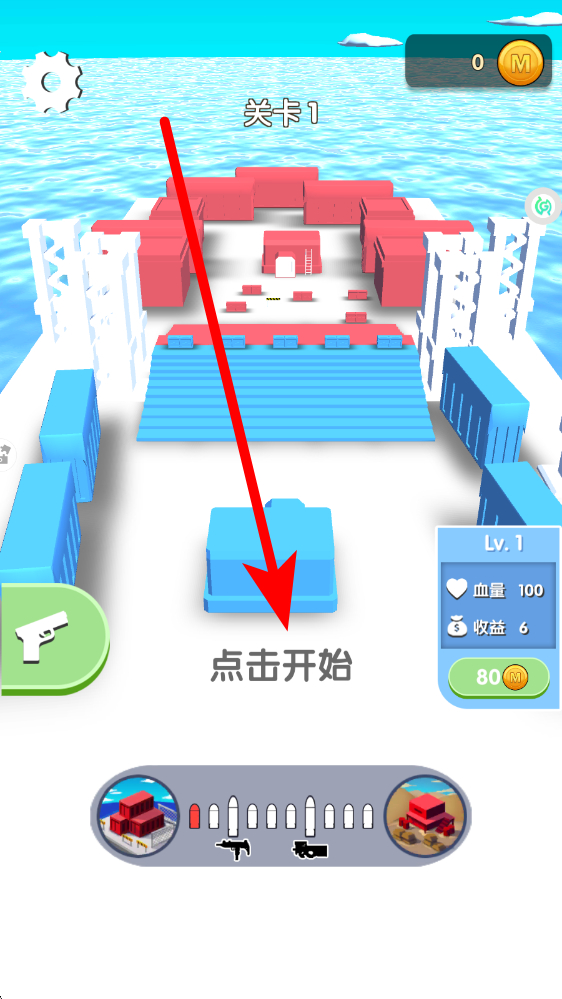 1、关卡启动点击界面点击开始游玩进入对应关卡,战前可以查看武器、血量及收益的信息,确认后开启战斗,迎接敌人波次攻击。