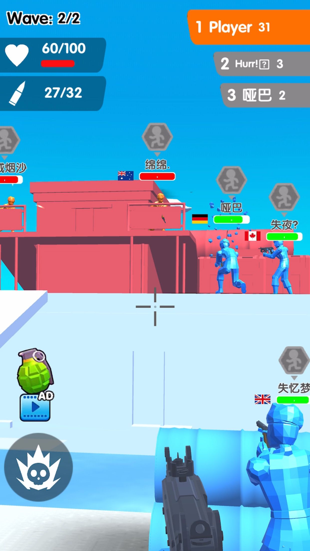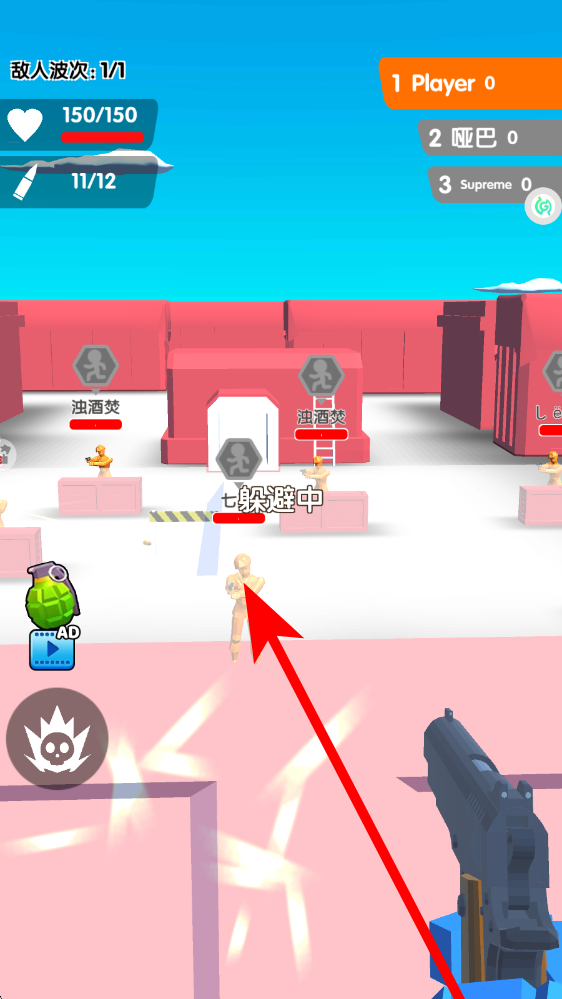 2、战斗简单操作操控武器射击敌人,借助场景掩体躲避伤害,左侧手雷道具可观看广告获取,精准打击积累击杀数,应对多敌围攻。