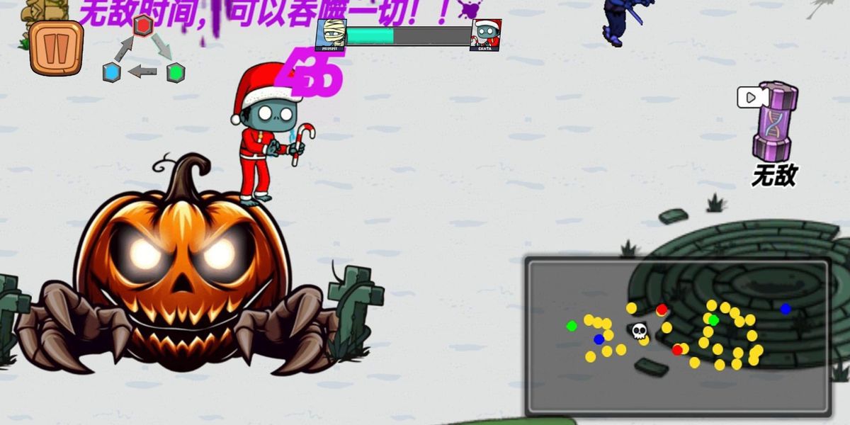 2、操控僵尸在场景移动,留意地形陷阱,遭遇南瓜怪、木乃伊等敌人时,利用道具增益或近身攻击对抗,把握时机闪避,维持战斗节奏。