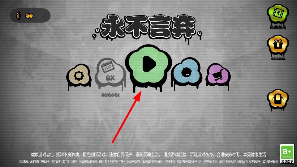 1、打开永不言弃游戏,进入主界面后,点击中间绿色的开始图标按钮,即可开启游戏关卡。