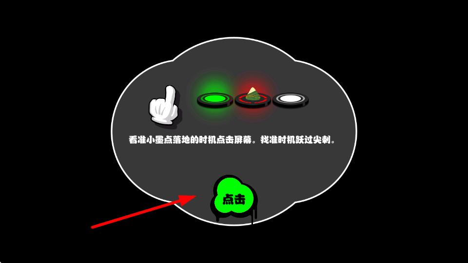 2、游戏开始前会出现操作提示,需要看准小墨点落地的时机点击屏幕,找准时机让小墨点跃过尖。
