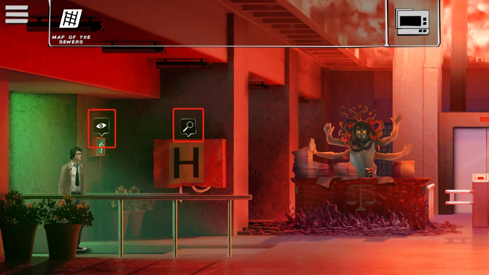 1、进入场景先点击墙上眼睛图标触发提示,再点放大镜探索H标识区域,留意人物与神秘雕像互动,获取线索推进。