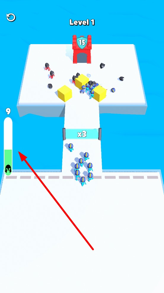1、进入关卡后,左侧进度条每格对应可召唤兵力,点击即可召唤小兵;留意路径上的倍增门,引导小兵经过,扩充军团。