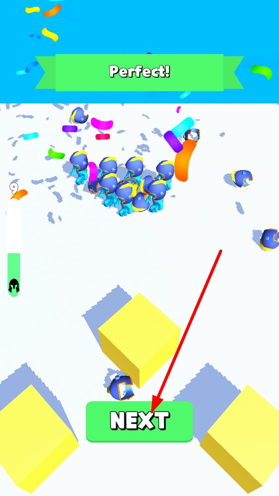 3、击溃屏幕内所有红色守卫后,将蓝色小兵集中引导至顶部红色城堡,持续攻击直至城堡血量归0,待弹出Perfect特效,点击NEXT按钮解锁下一关。