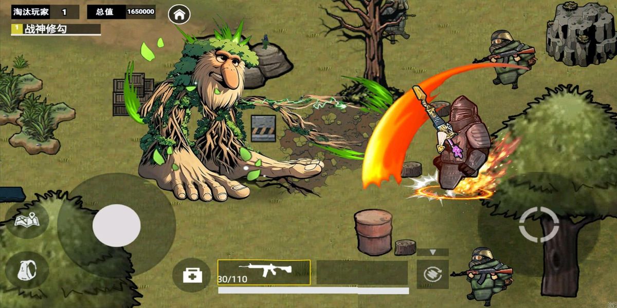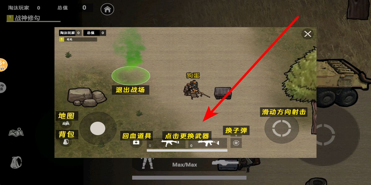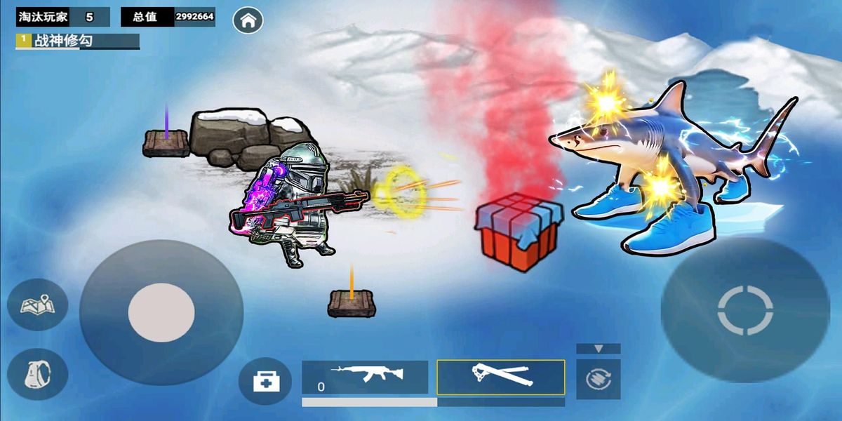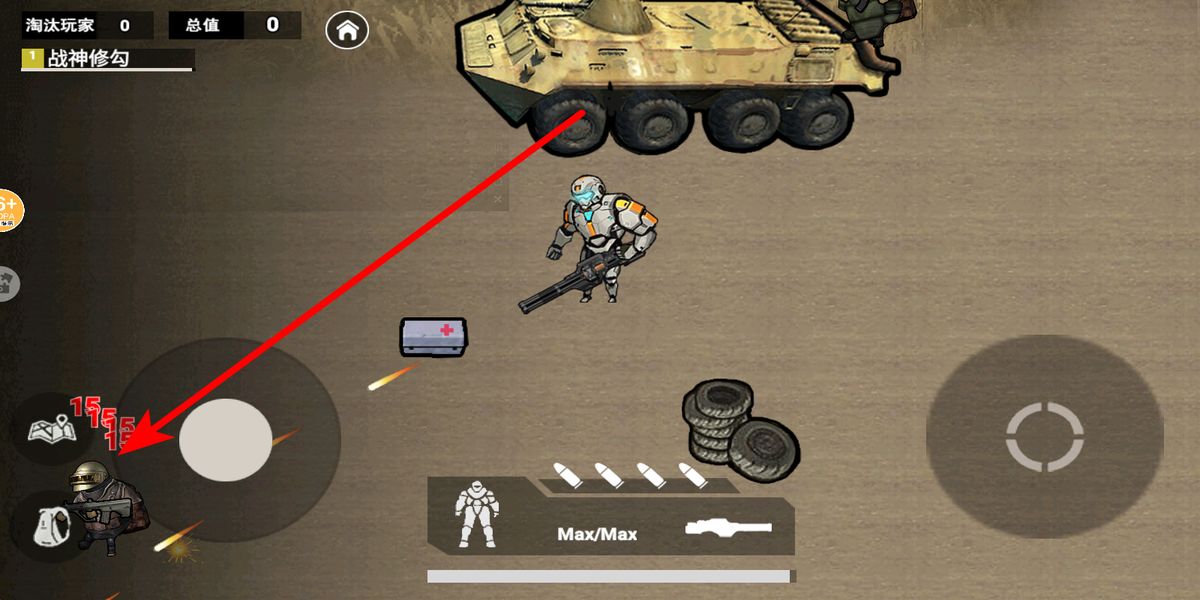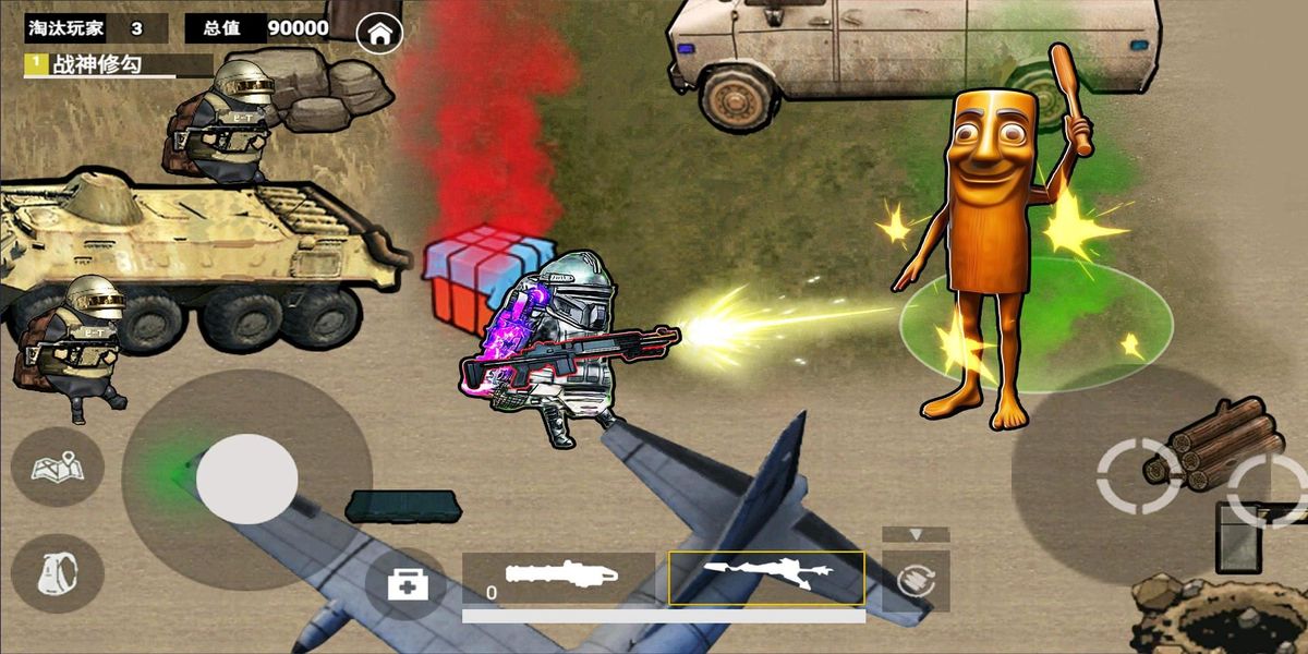2、进入战场后,点击更换武器切换枪械,滑动射击键瞄准敌人攻击,借助回血道具续航,利用掩体躲伤害,维持作战节奏。