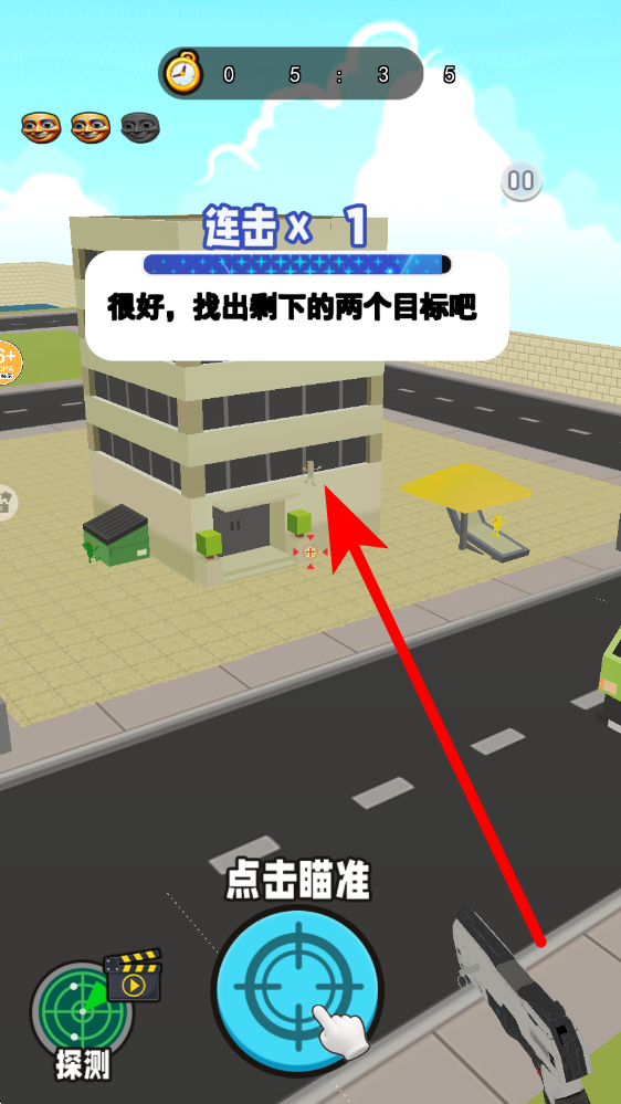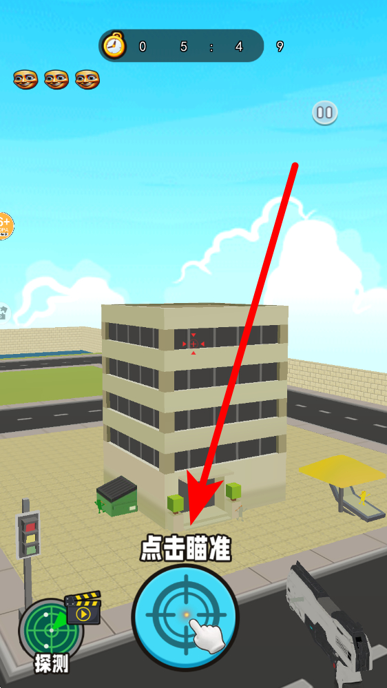 2、点击瞄准按钮,激活瞄准视角,滑动屏幕调整镜头,搜寻建筑、场景角落隐藏的外星人,锁定位置,规划射击顺序,触发连击提升消灭效率。