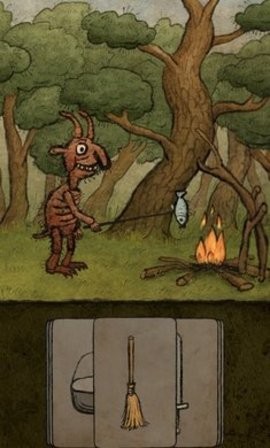 魔鬼住在山洞里,我们拿硬币或橡果、蘑菇随便一个什么东西扔一下他就会出来,我们同意他把神父从教堂绑走,帮他找一根绳子,于是他就成了我们的伙伴,而绳索在如图所示的区域,这里有一朵红蘑菇,我们也可以顺手采收。
