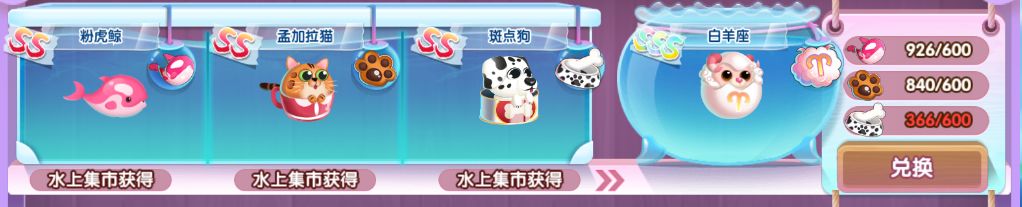 在收集齐到粉虎鲸、孟加拉猫、斑点狗三种萌鱼后,产鱼宝即可兑换sss级白羊座。