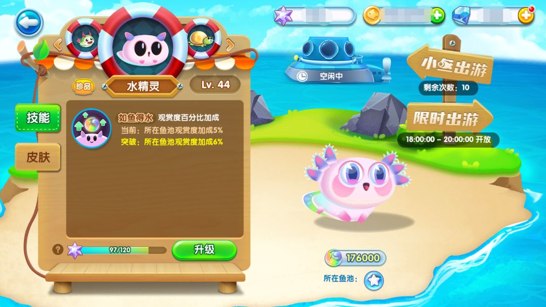 宠物还能出游,分为两种,普通出游跟限时出游,两边都能获得对应的鱼,宠物升级所需的材料也是出游获得哦~
