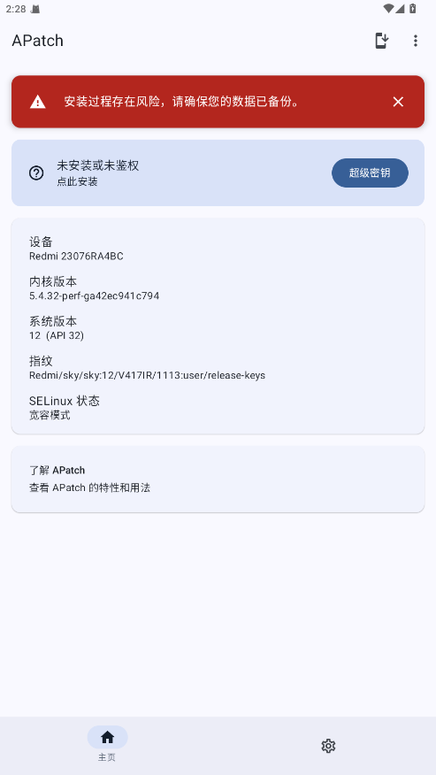 打开APatch应用 → 点击“修补”或“安装” → 选择设备的boot.img文件 → 在输入框中自定义设置超级密钥(支持数字、字母或符号组合,例如123456) → 开始修补156。