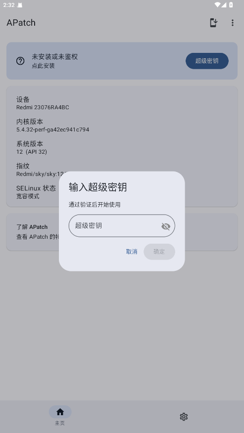 刷入修补后的镜像并重启手机后,首次打开APatch应用会要求输入之前设置的超级密钥以激活Root权限15。