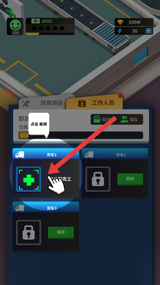 3、资源与设施迭代,消耗足够的金币来解锁新的货车、扩充员工的团队,用钻石来加速改良项目的进度。