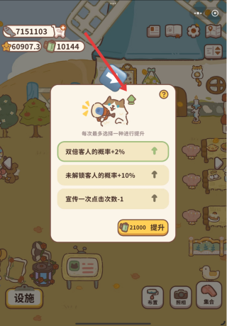 2、点击设施后会弹出相关提升选项界面,每次最多选择一种进行提升,点击提升按钮来强化对应属性。