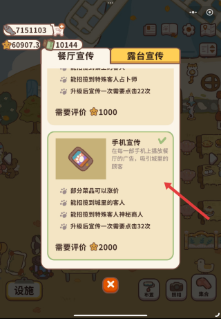 3、继续操作,找到餐厅宣传和露台宣传选项卡,就能选择切换宣传方式,吸引不同类型客人。