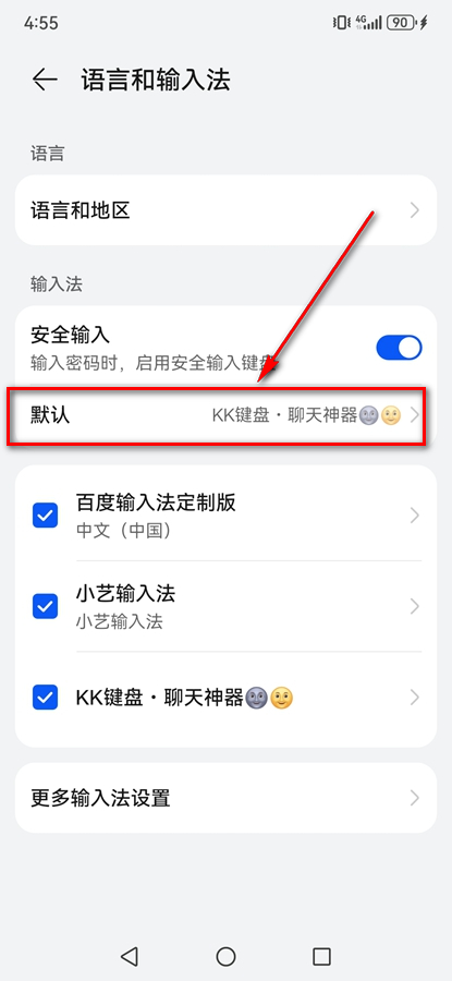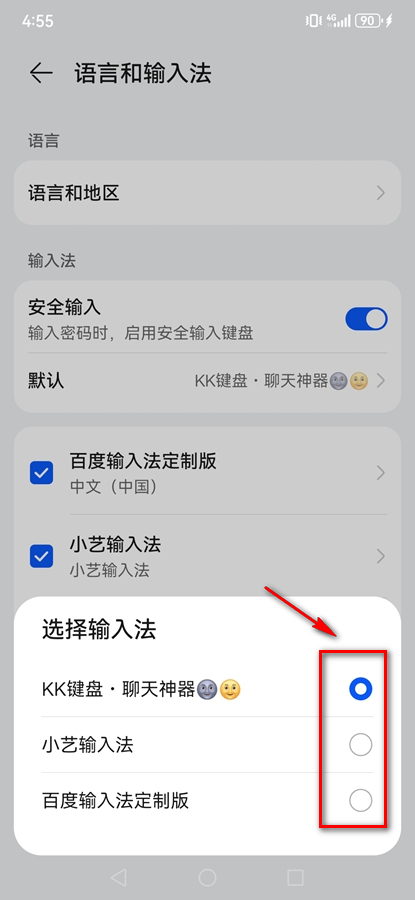 2、接下来选择下方的“切换到KK键盘”功能,就可以选择“KK键盘”作为手机默认的输入法了;