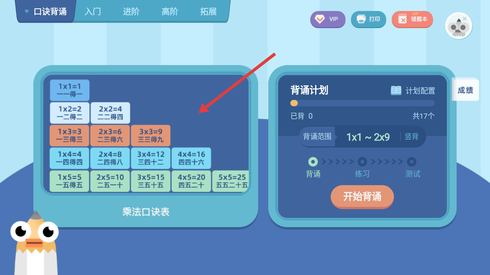 1、进入【口诀背诵】界面,先熟悉【乘法口诀表】布局,搭配【背诵计划】可规划学习进度,开启口诀学习。
